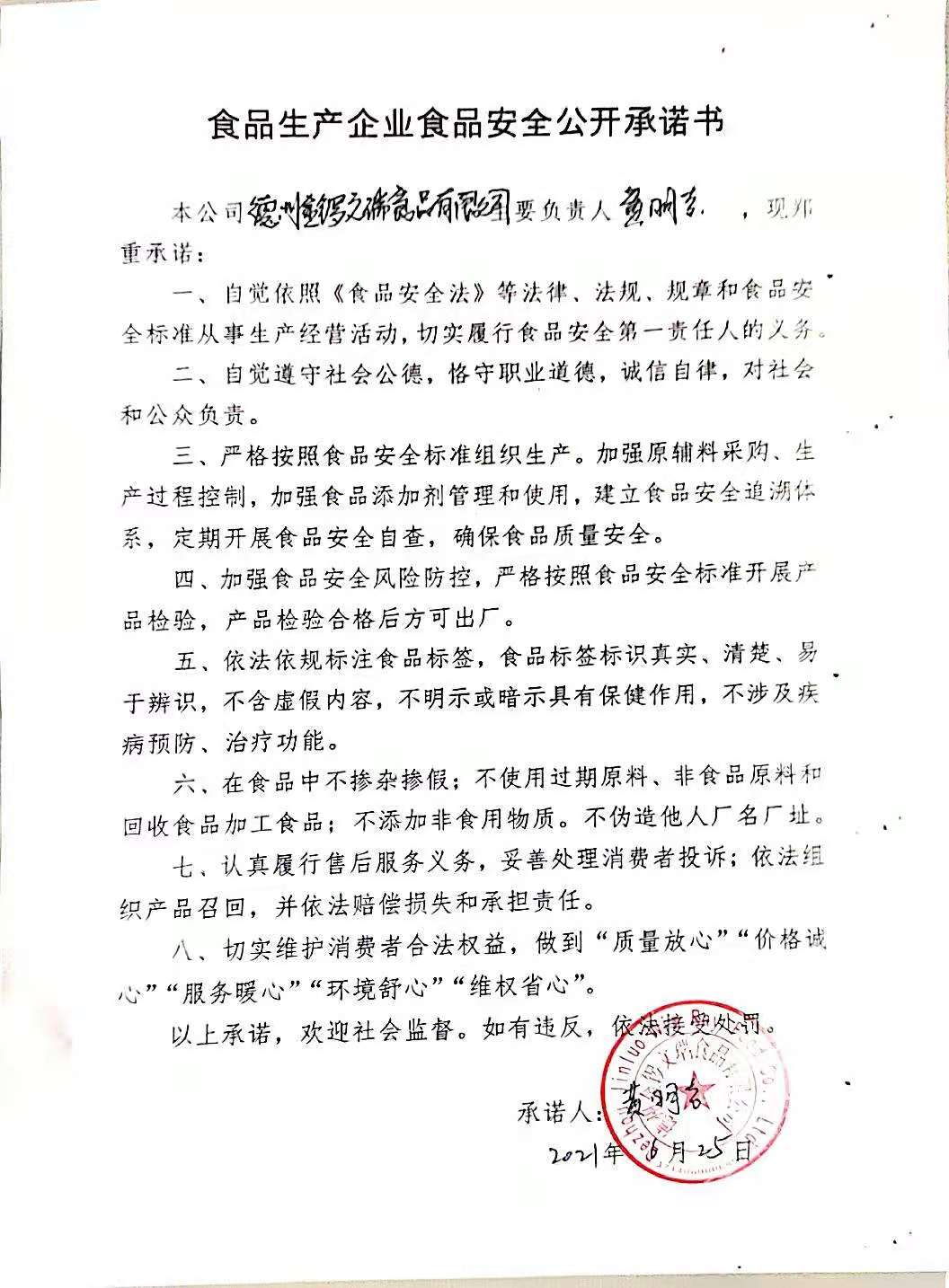 臨沂金鑼文瑞食品安全承諾書