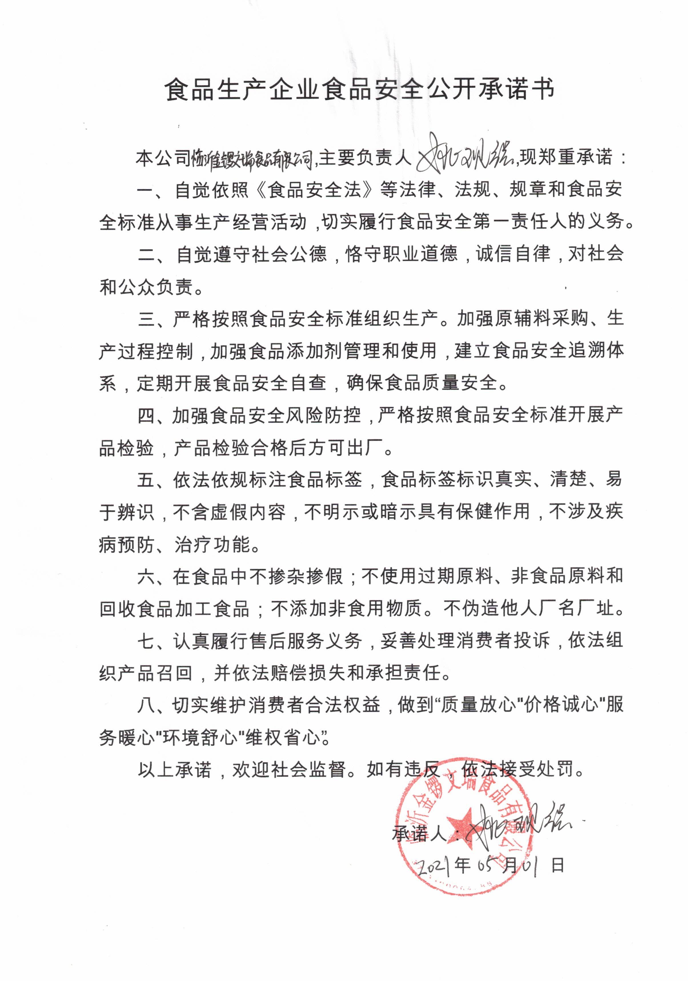 臨沂金鑼文瑞食品安全承諾書